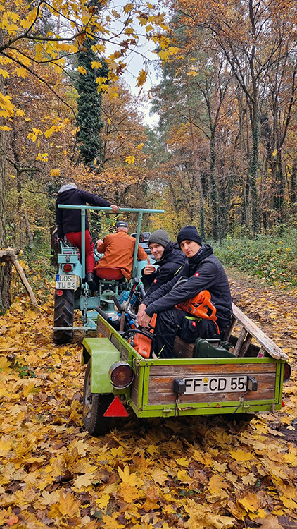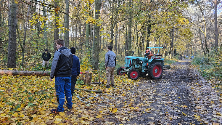 Zu Beginn der Woche stand das Aufräumen des Waldes auf dem Plan. Das zugehörige Tot-Holz musste aus dem Wald entfernt und anschließend in kleine Stücke geschnitten werden. Dabei lernten die Auszubildenden den richtigen Umgang mit Werkzeugen und Maschinen, um Holz auf eine sichere und effiziente Weise zu verarbeiten.